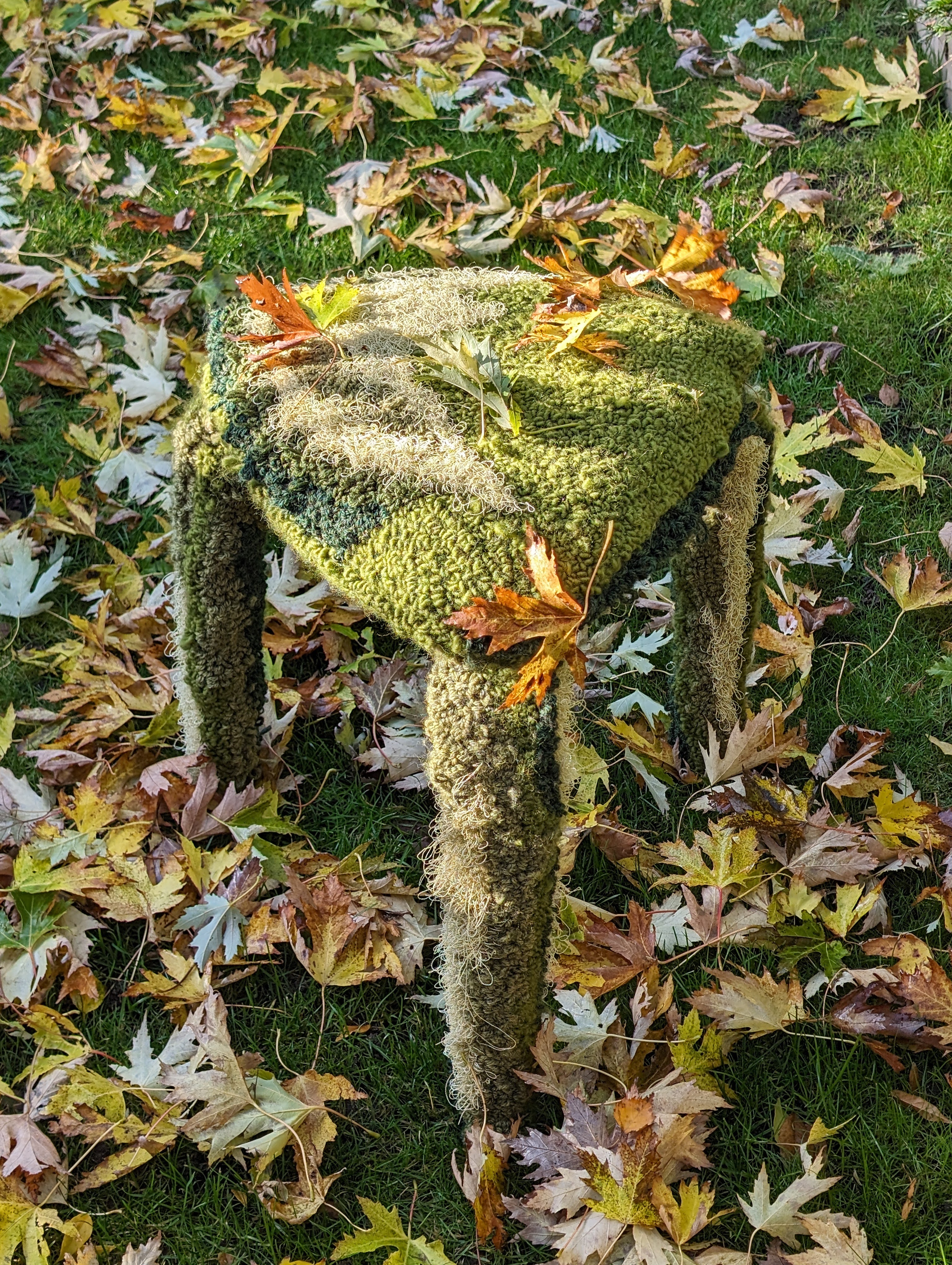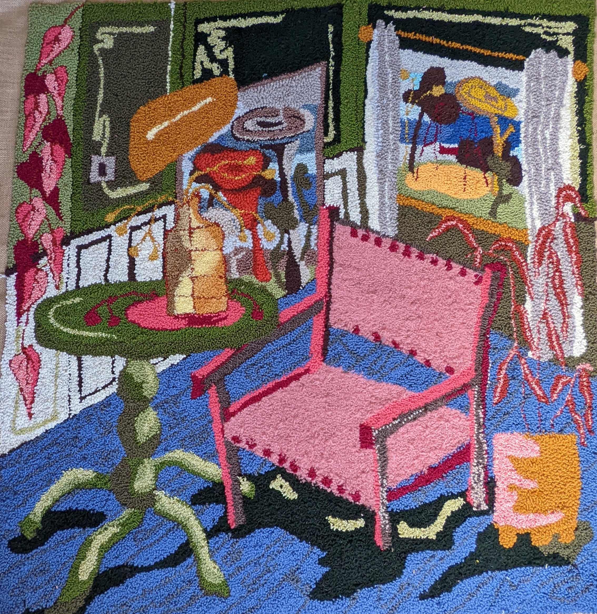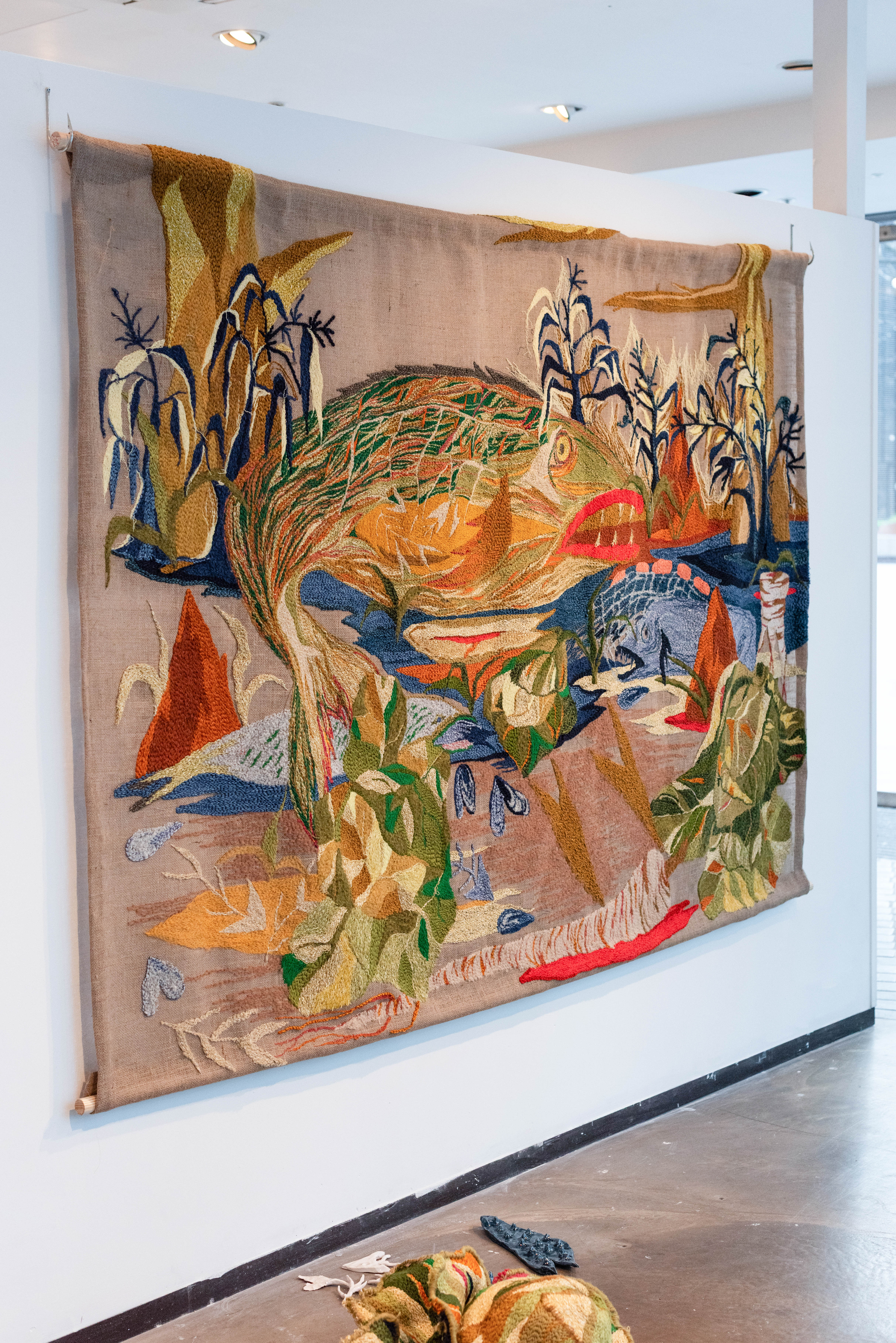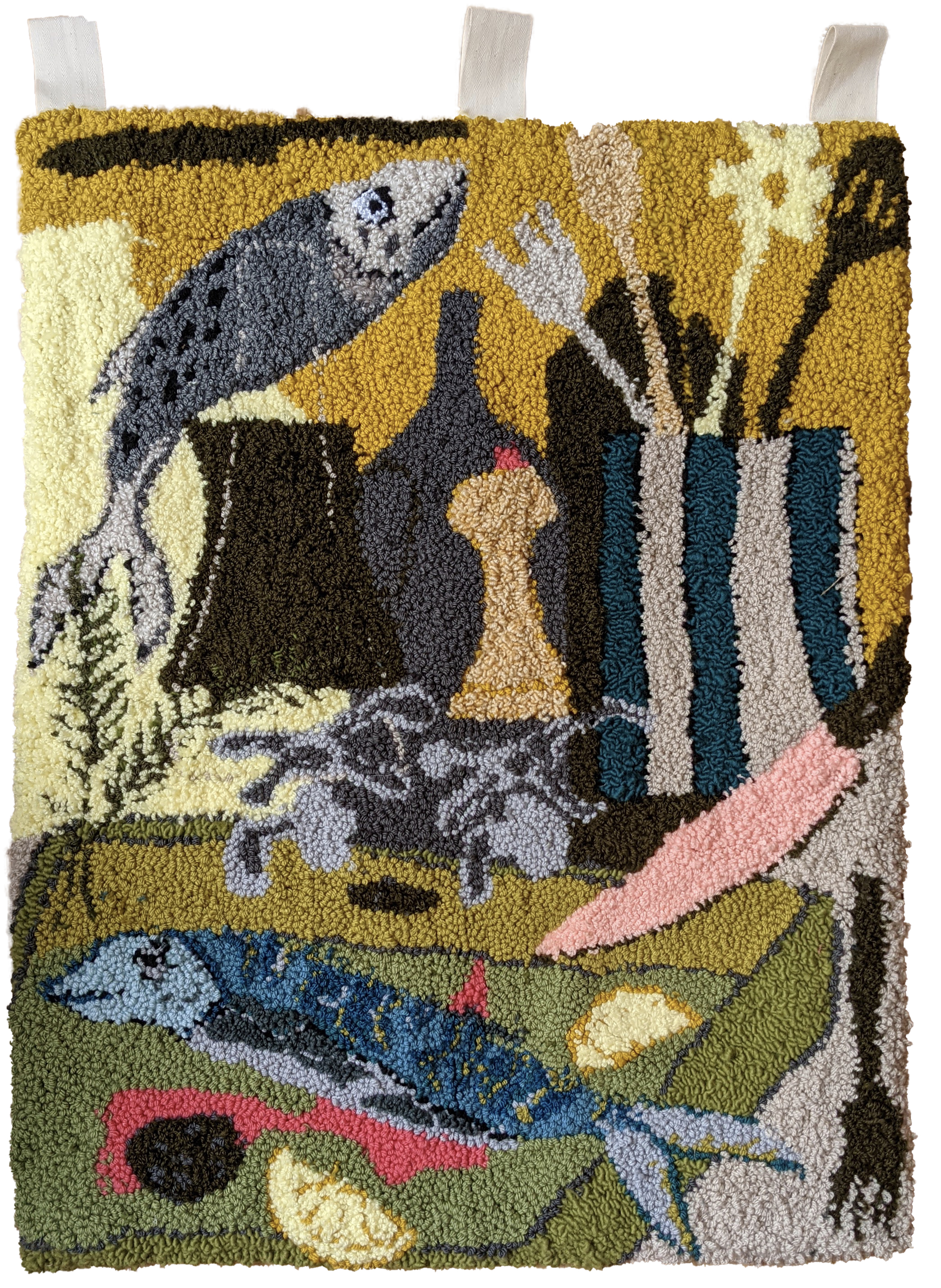 The work consists of 1 plywood island, 8 ceramic apples, 2 ceramic vases, 3 tufted apples, 3 3D printed horned melons, a miniature wool & wire swing, a large tufted rope and a tufted mound made with airdried clay. All tufted objects are made using hessian and yarn.